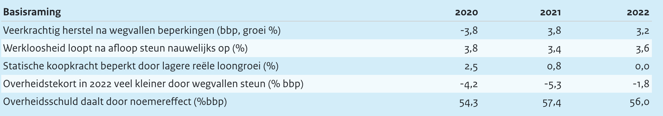 De economie groeit in 2021 met bijna 4%, gevolgd door ruim 3% groei in 2022. Hierbij wordt er van uitgegaan dat er geen grootschalige nieuwe contactbeperkingen nodig zijn. De werkloosheid loopt na het wegvallen van de steunmaatregelen slechts licht op tot 3,6% in 2022, daarmee blijft er sprake van krapte op de arbeidsmarkt. Dit blijkt uit de zojuist gepubliceerde augustusraming van het Centraal Planbureau (CPB). Deze raming vormt voor het kabinet het startpunt voor de afrondende besluitvorming over de begroting 2022. Op Prinsjesdag (21 september) publiceert het CPB de Macro Economische Verkenning (MEV). In die raming is alle besluitvorming van de begroting 2022 verwerkt.