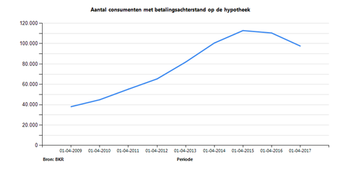Op 1 april 2016 was het aantal mensen met een betalingsachterstand op hun hypotheek 110 duizend. Op 1 april 2017 -een jaar later- is dat aantal gedaald met 12 procent. Ongeveer de helft van deze daling is echter te relateren aan een hercodering in de BKR-administratie. De andere helft is een voortzetting van de maatschappelijke trend.