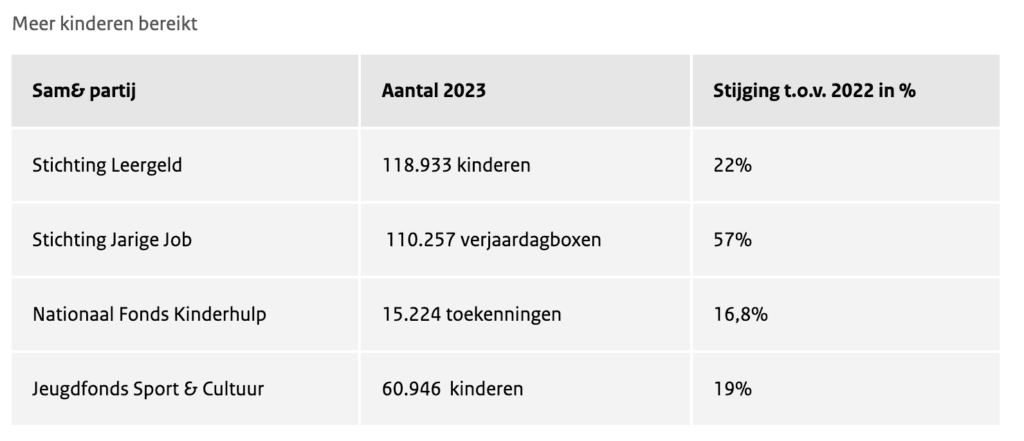 Er zijn verschillende maatregelen genomen zodat mensen die leven in armoede zoveel mogelijk mee kunnen doen in de samenleving. Zo is de subsidie aan SAM& – het samenwerkingsverband van Leergeld Nederland, Jeugdfonds Sport & Cultuur, Nationaal Fonds Kinderhulp en Stichting Jarige Job – het afgelopen jaar eenmalig met € 4,5 miljoen verhoogd naar € 14,5 miljoen. Bij deze organisaties kunnen ouders terecht om geld aan te vragen voor bijvoorbeeld een bijdrage aan de contributie van de voetbalclub of benodigdheden voor een verjaardagsfeestje. Mede door de extra middelen is het aantal kinderen dat tot oktober 2023 is bereikt met 27% gestegen ten opzichte van 2022.
